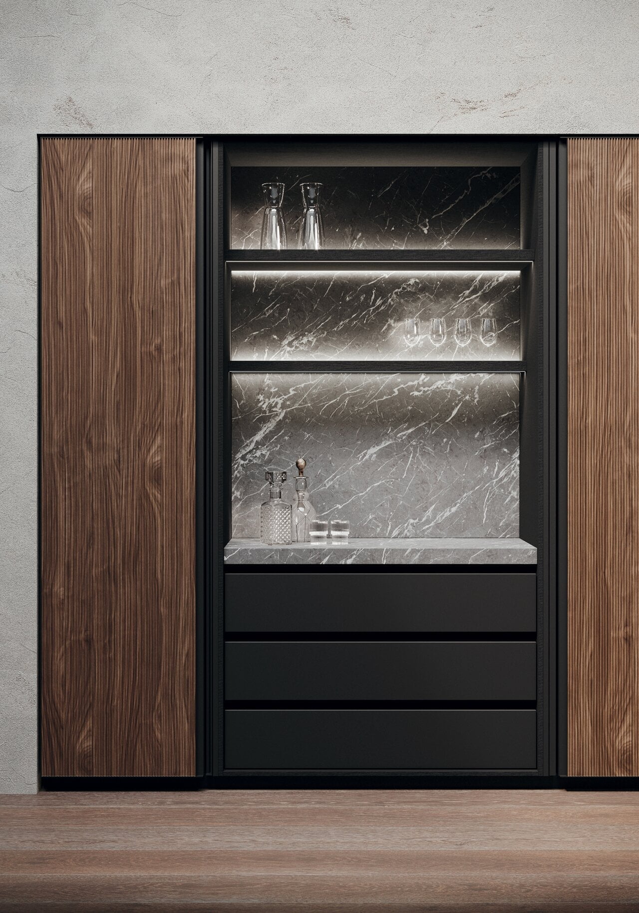 Détail de la colonne avec portes escamotables avec cadre en aluminium noir et finition bois noyer Canaletto avec personnalisation des nervures.