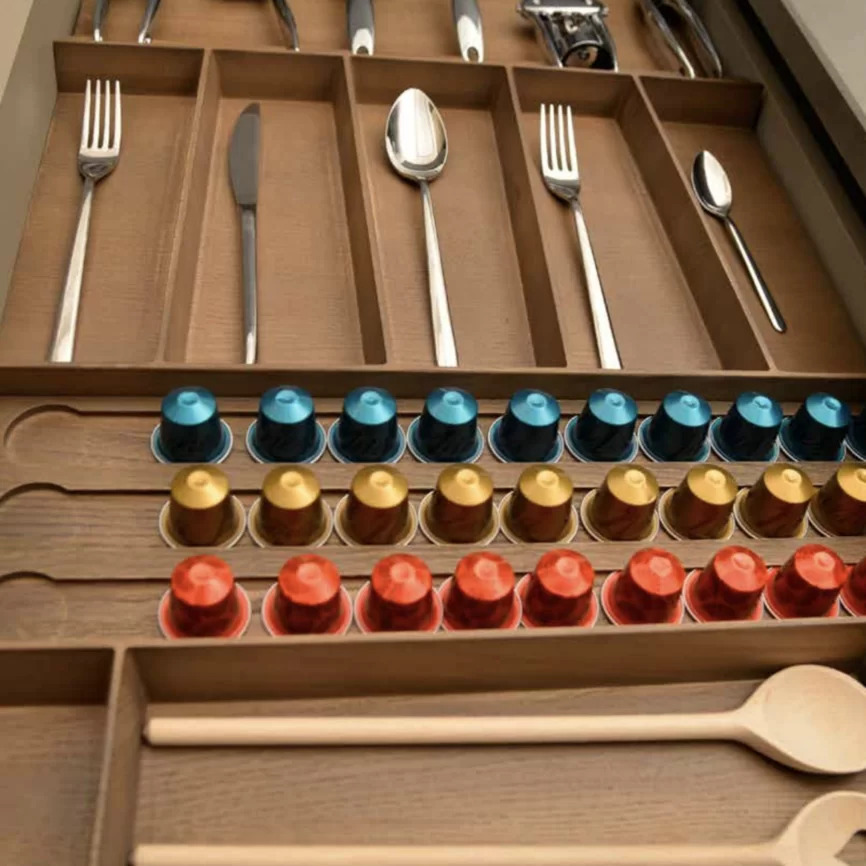 Nos meubles intègrent des range couverts compartimentés afin de stocker facilement vos fourchettes, couteaux, cuillères, etc.
